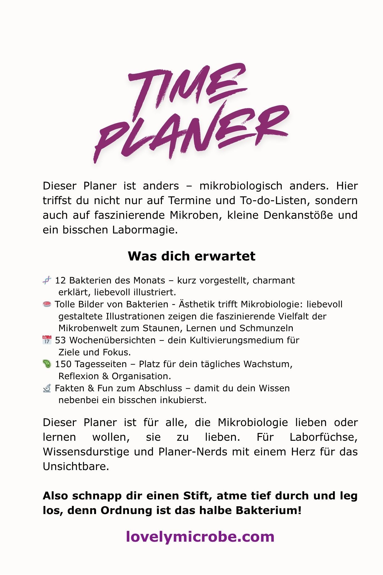 Der Mikrobioplaner ist kein gewöhnlicher Kalender. Er ist dein persönliches Kultivierungsmedium für Fokus, Wissen und Wachstum. Tauche ein in die faszinierende Welt der Mikroben und plane dein Jahr mit Stil, Struktur und einem Hauch Labormagie.