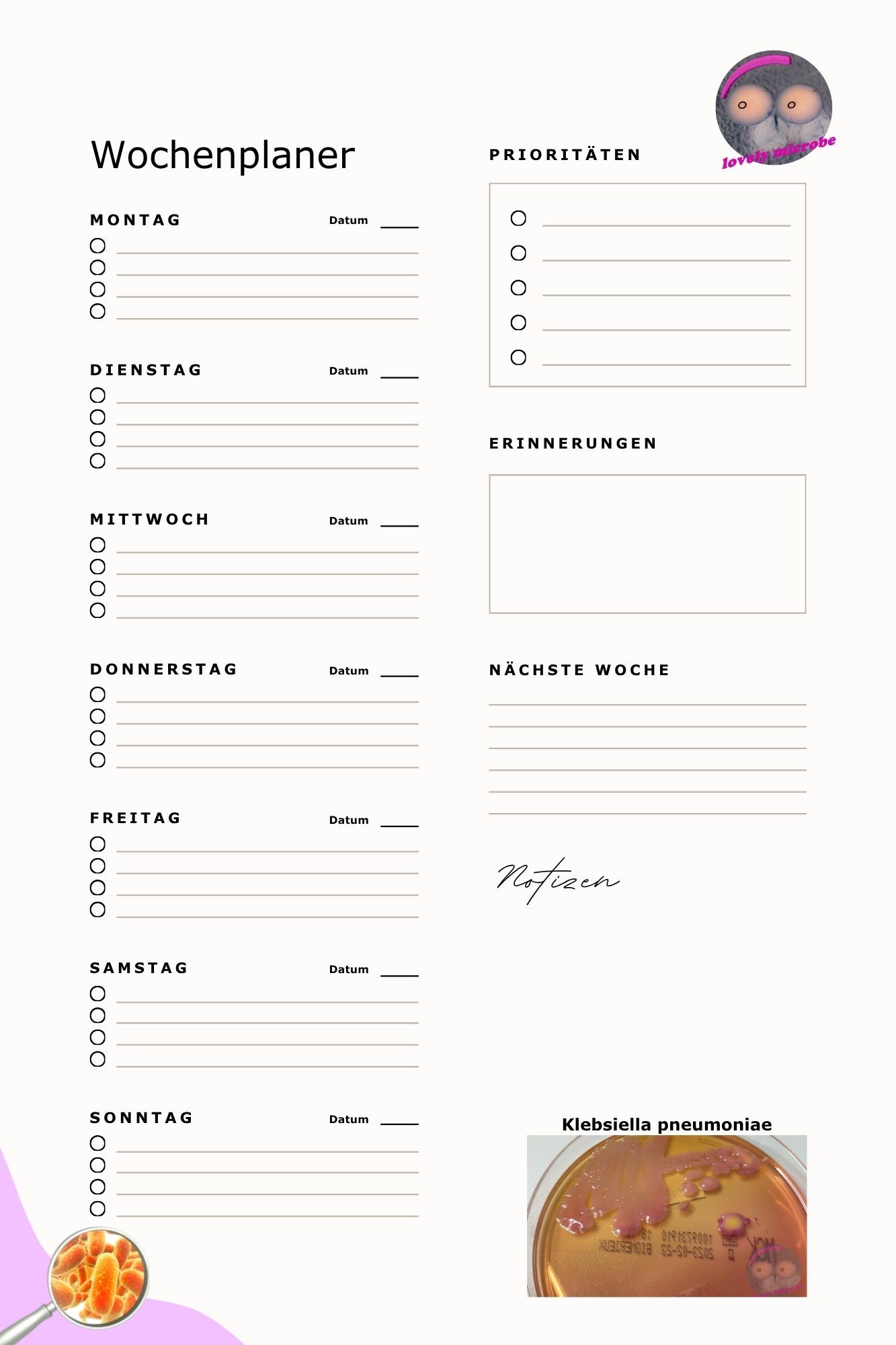 Für alle, die Mikrobiologie lieben, im Labor arbeiten, studieren oder einfach ein außergewöhnliches Notiz- und Planungstool suchen. Plane deine Zeit mit Bakterien, denn Ordnung ist das halbe Bakterium!